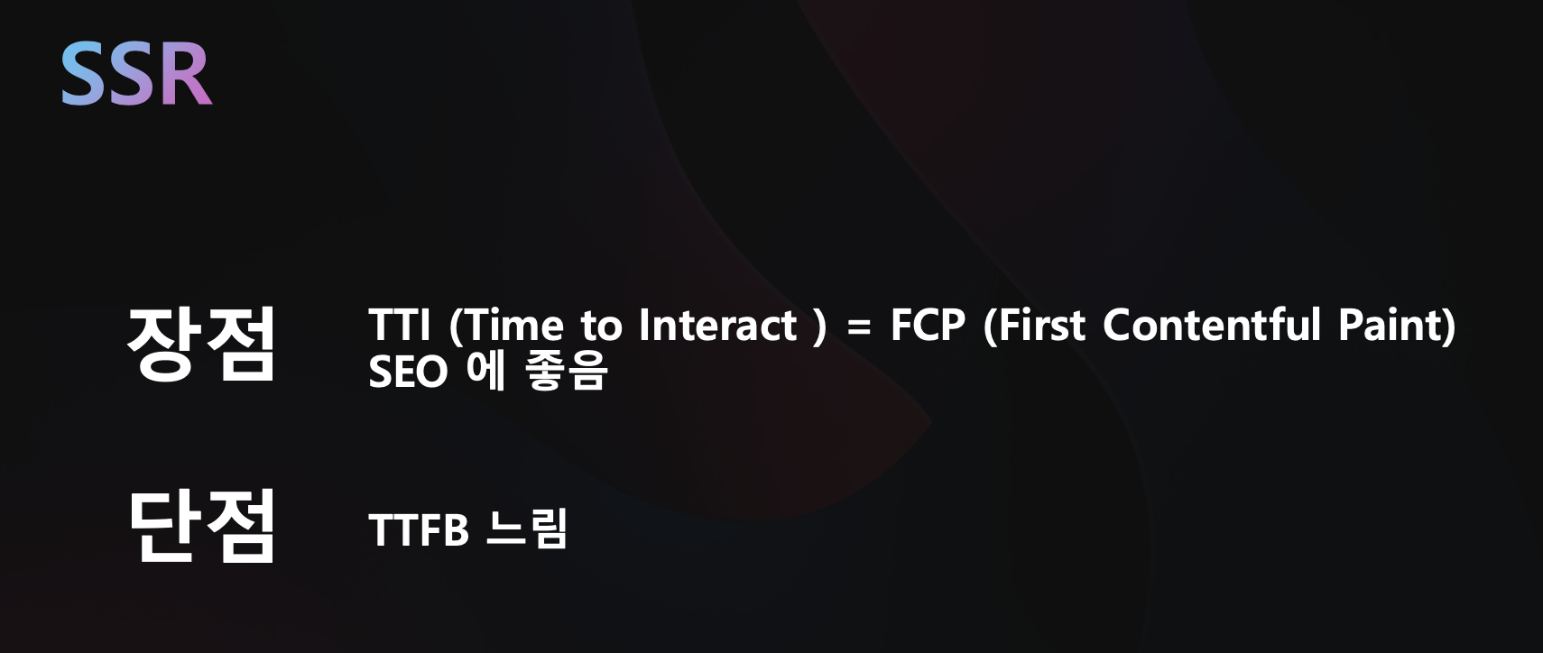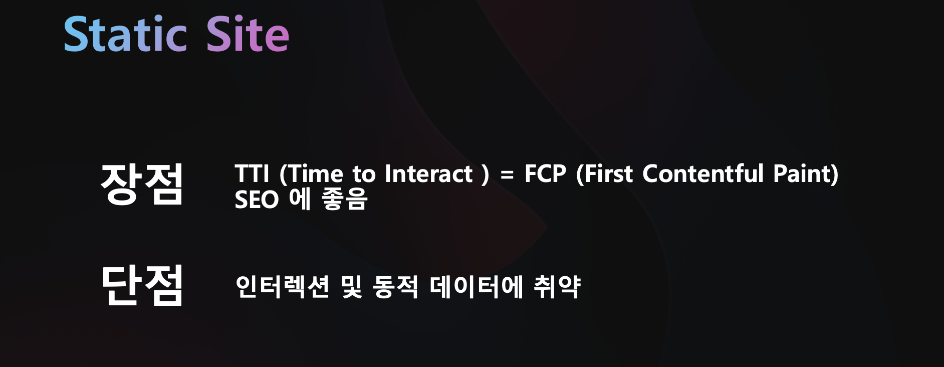 Static Site ์ ๋์ผํ๊ฒ TTI ์ FCP ๊ฐ ๋์ผํ๋ค๋ ์ ๊ณผ SEO ์ ์ข๋ค๋ ์ฅ์ ์ด ์์ต๋๋ค.
