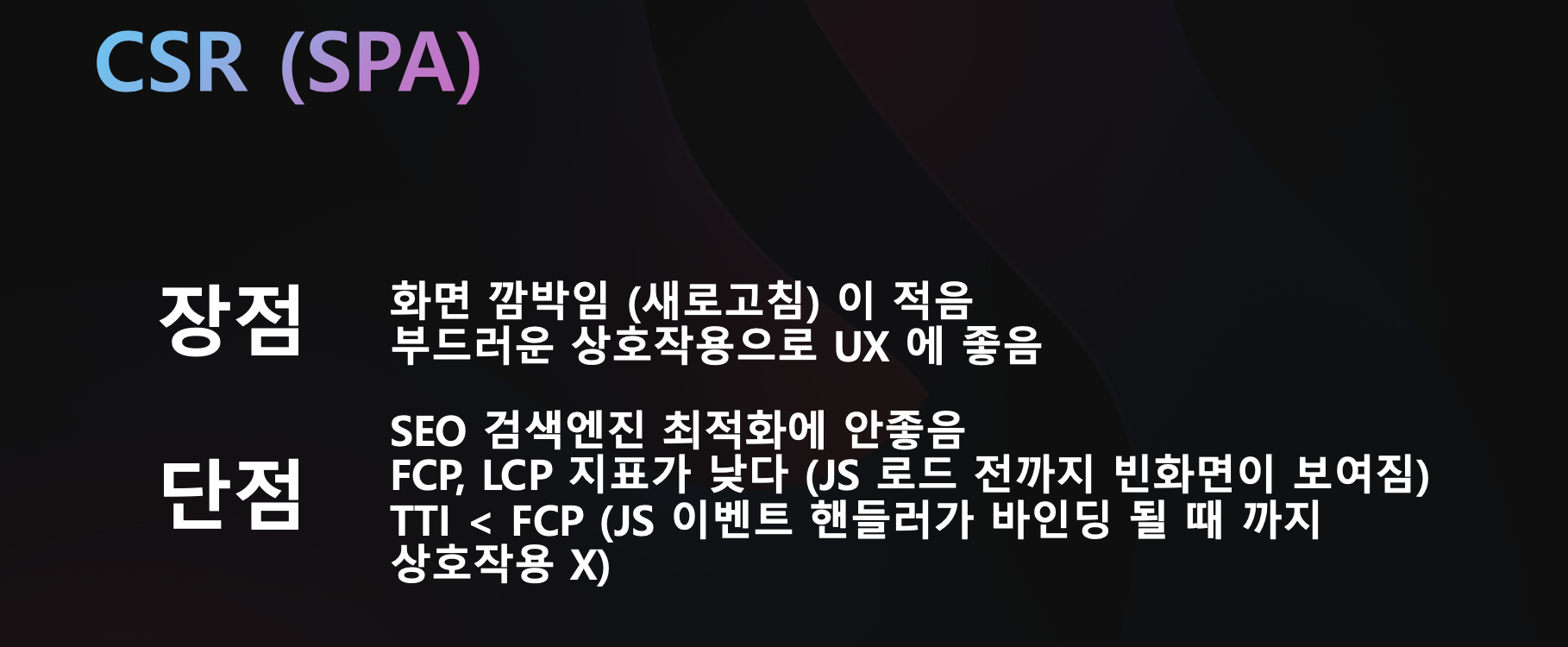 ํ์ง๋ง ์๋ฒ์์ ๋ฐ์ดํฐ๋ฅผ ๋ฐ์์ ์ฝ์ ํ, ์๋ต์ผ๋ก ๋ณด๋ด๋๋ฐ ์๊ฐ์ด ๊ฑธ๋ฆฌ๊ธฐ ๋๋ฌธ์ TTFP ๊ฐ ๋๋ฆฌ๋ค๋ ๋จ์ ์ด ์๊ณ , ์๋ก์ด ํ์ด์ง๋ฅผ ์ ์ํ ๋ ๋ง๋ค, ์๋ก์ด HTML ์ ์์ฒญํ๊ณ ํ๋ฉด์ด ๊น๋ฐ์ฌ UX ์ ์ข์ง ๋ชปํ๋ค๋ ๋จ์ ์ด ์์ต๋๋ค