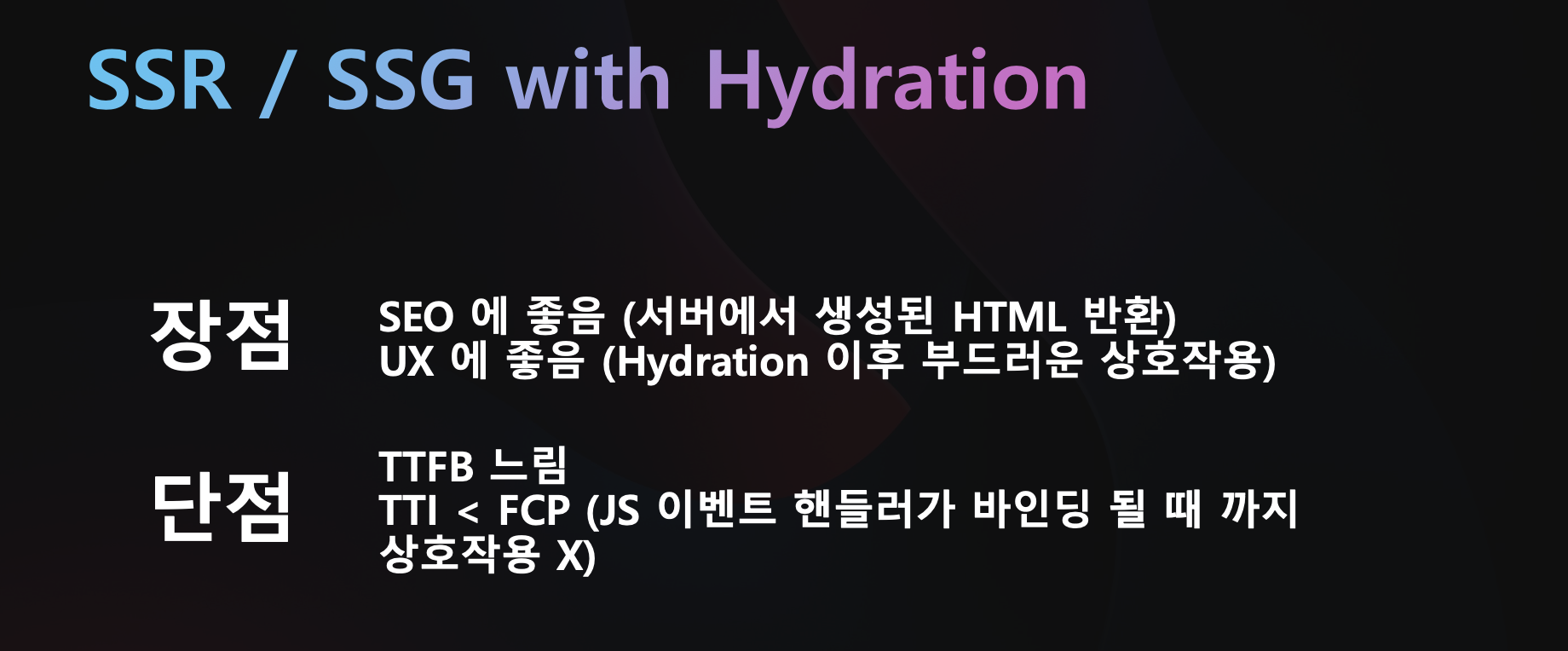 SSR with Hydration ๊ณผ SSG with Hydration ์ ํฉ์น ๋ ๋๋ง ํจํด์ด๋ผ๊ณ ๋ณผ ์ ์์ต๋๋ค