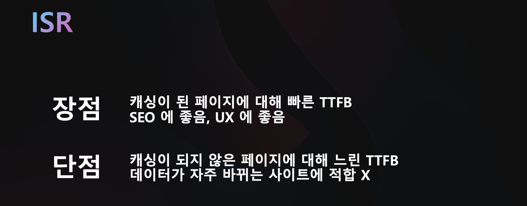 ์บ์ฑ๋ ํ์ด์ง์ ๋ํด์๋ TTFB ๊ฐ ๋น ๋ฅด๋ค๋ ์ฅ์ ์ด ์์ง๋ง, ๋ฐ์ดํฐ๊ฐ ์์ฃผ ๋ฐ๋๋ ์ฌ์ดํธ์์๋ ์ ํฉํ์ง ์์ต๋๋ค.