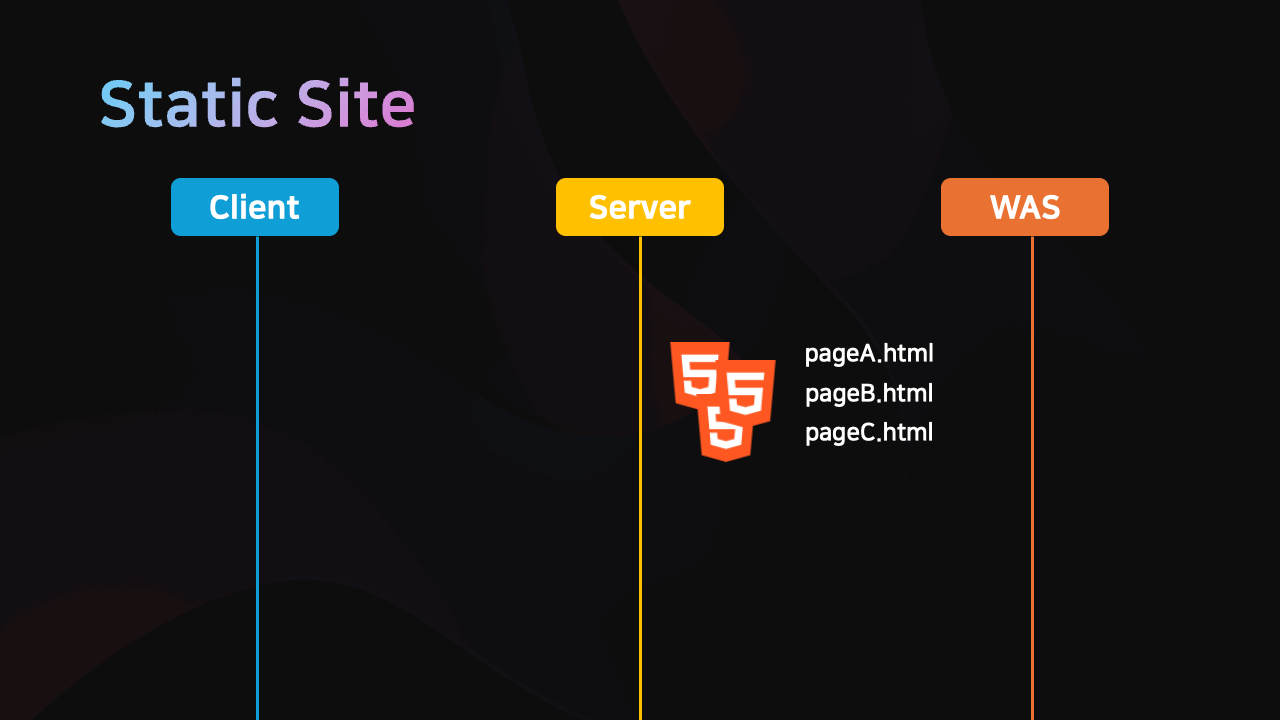 ํด๋ผ์ด์ธํธ๊ฐ ํน์ ํ์ด์ง์ ์ ์ํ๋ฉด, ์ ์ ์ธ HTML, CSS, JS ๋ฅผ ์ ๊ณตํฉ๋๋ค. AWS S3 ๋ฒํท๊ณผ ๊ฐ์ ์ ์ฅ์์ ์ฌ๋ฆฌ๊ฑฐ๋, NginX ๋ฑ์ ์ฌ์ฉํด ์ ์ ์ธ ํ์ด์ง๋ ์๋น๋ฉ๋๋ค